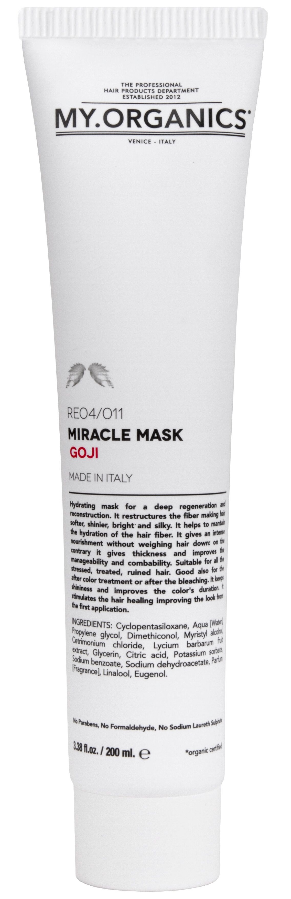 Produktová řada MY.ORGANICS Resurrection se specializuje na regeneraci vlasů, jež byly extrémně zatíženy chemickými úpravami, špatnou péčí, nebo nepříznivými vnějšími vlivy, jako jsou smog, sůl či chlór. Miracle Mask Goji 200ml je zázračná hydratační maska, která proniká hluboko do vlasových vláken, posiluje jejich strukturu a poskytuje vlasům nezbytnou výživu. Díky tomu dodává vlasům hebkost, lesk a sametovou hebkost bez zatížení.