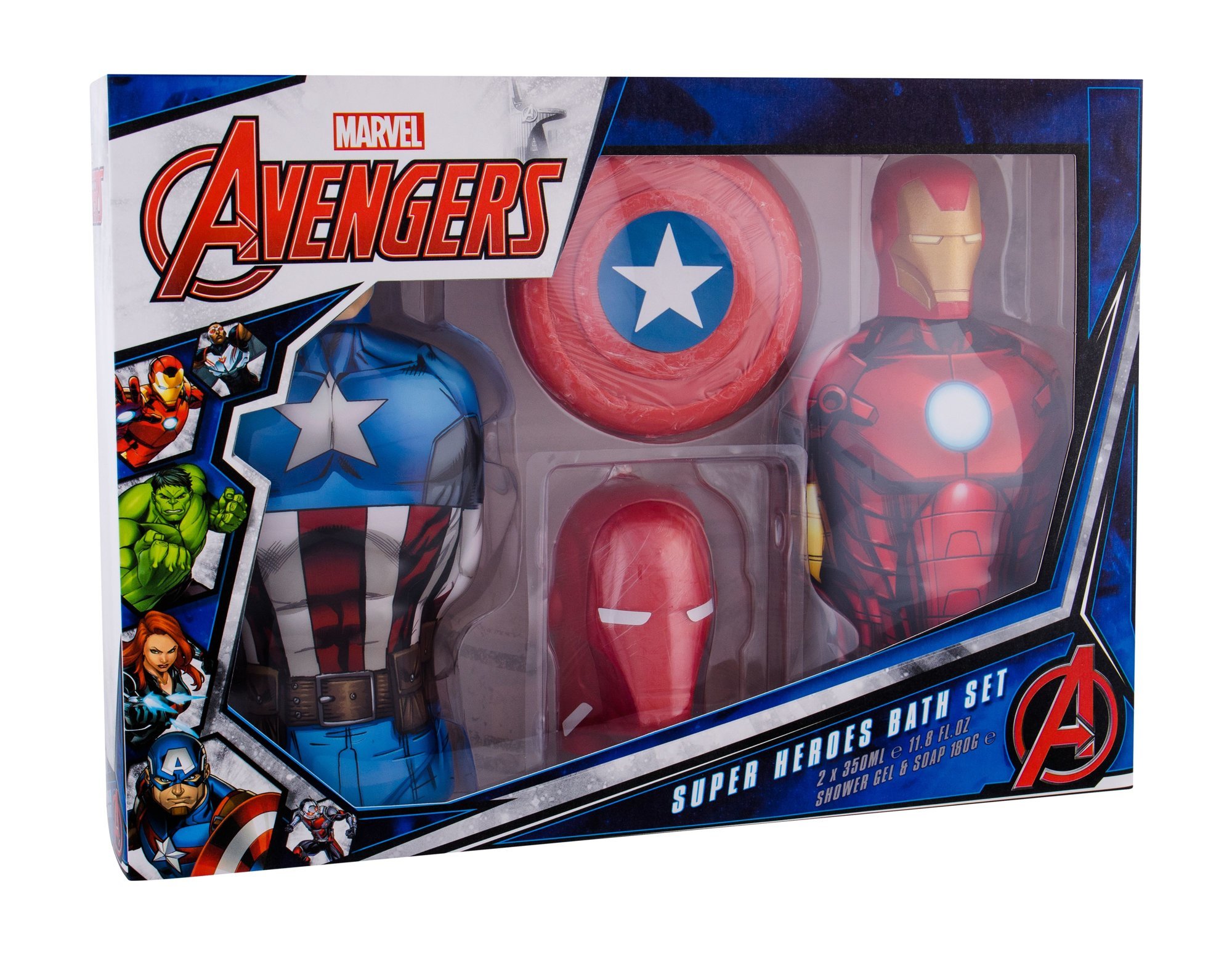Dárková sada sprchové kosmetiky **Marvel Avengers** pro milovníky filmových hrdinů stejnojmenné filmové série. **Složení kazety:** Sprchový gel **Marvel Avengers Shower gel Captain America 350 ml.** Sprchový gel **Marvel Avengers Shower gel Iron Man 350 ml.** Mýdlo **Marvel Avengers Soap Captain America 180 g.** Mýdlo **Marvel Avengers Soap Iron Man 180 g.**