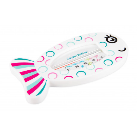 Teploměr je dostupný v několika barvách.Produkt neobsahuje rtuť. K měření teploty se používá vyčištěný petrolej zapuštěný v trubici. Trubice je umístěna tak, aby byla pro ruce miminka nepřístupná.Poznávání teploty je snadné a jasné.Neobsahuje rtuť.1 kus v balení.Nemyjte v myčce.Návod k použití: Vanový teploměr slouží k měření teploty vody ke koupání malého dítěte. K měření teploty vody se používá vyčištěný petrolej zapuštěný v trubici.Pozornost! Doporučená teplota koupání pro malé dítě by měla být 32-37°C a je označena na stupnici symbolem smajlíka.Symbol sněhové koule - teplota vody je příliš nízká. Symbol slunce - teplota vody je příliš vysoká.Pokud se stupnice teploměru oddělí, ponořte ji do horké vody, aby se obnovila kontinuita stupnice.Upozornění! Důležité pro bezpečnost a zdraví Vašeho dítěte! Udržujte teploměr čistý. Před prvním použitím omyjte měkkým kartáčkem pod tekoucí vodou s jemným čisticím prostředkem.Nevařit, nesterilizovat. Po každém použití teploměr a jeho vnitřek důkladně omyjte několikanásobným ponořením do teplé vody a mycího prostředku.Skladujte na suchém místě. Zkontrolujte kvalitu produktu, než jej dáte svému dítěti.Opotřebovaný, poškozený, okousaný výrobek, vyměňte jej za nový. Nikdy nenechávejte miminko při koupání bez dozoru.Uschovejte si tento návod, protože obsahuje důležité informace.Při prvních známkách poškození nebo opotřebení - vyhoďte.Teploměr odpovídá požadavkům: Směrnici Evropského parlamentu a Rady 2001/95/EC o obecné bezpečnosti výrobků.