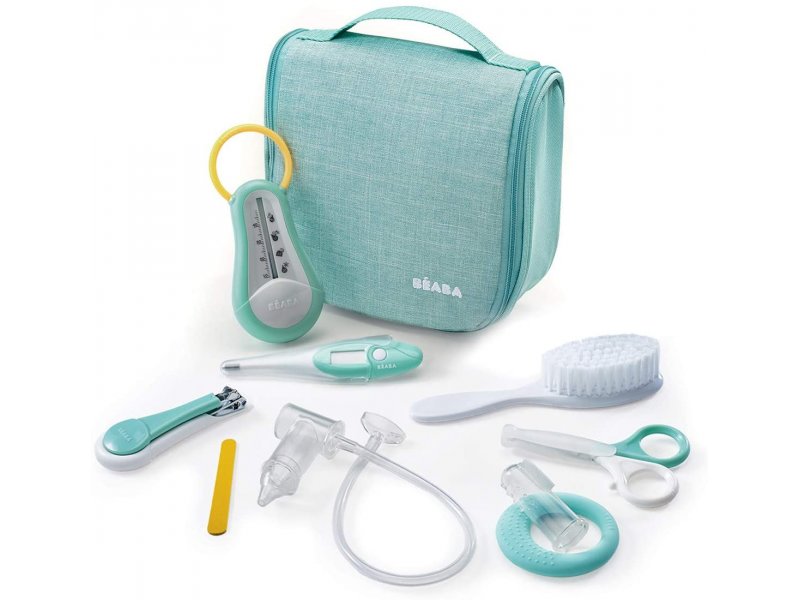 Závěsné toaletní pouzdro Beaba obsahuje devět základních doplňků pro hygienu a péči o dítě v kvalitním provedení: teploměr do vody, digitální teploměr, nůžky a kleštičky na nehty, kartáč na vlasy, kousátko, masážní kartáček na dásně, odsávačku hlenů a pilník na nehty.