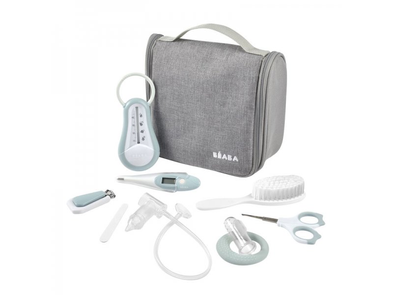Závěsné toaletní pouzdro Beaba obsahuje devět základních doplňků pro hygienu a péči o dítě v kvalitním provedení: teploměr do vody, digitální teploměr, nůžky a kleštičky na nehty, kartáč na vlasy, kousátko, masážní kartáček na dásně, odsávačku hlenů a pilník na nehty.