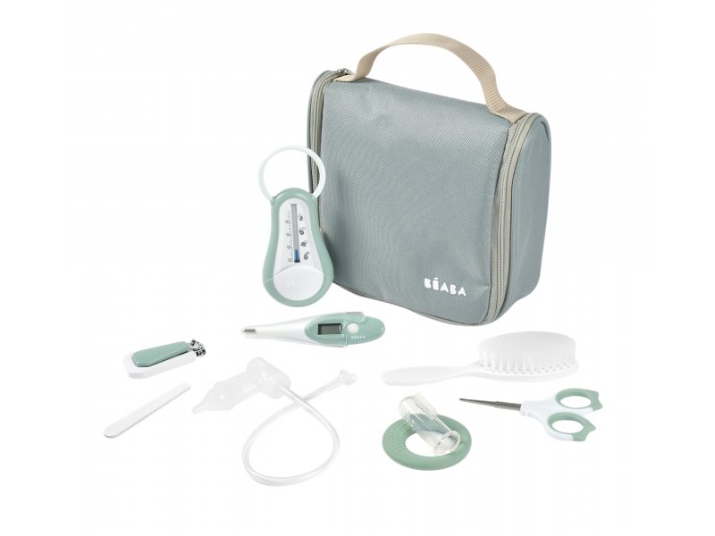 Závěsné toaletní pouzdro Beaba obsahuje devět základních doplňků pro hygienu a péči o dítě v kvalitním provedení: teploměr do vody, digitální teploměr, nůžky a kleštičky na nehty, kartáč na vlasy, kousátko, masážní kartáček na dásně, odsávačku hlenů a pilník na nehty.