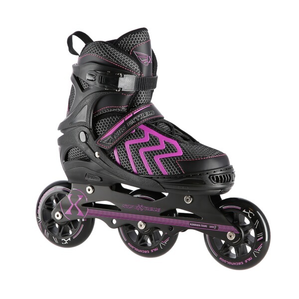 Kolečkové brusle NILS Extreme NA19318 jsou určeny pro rekreační a zkušené jezdce. Model NA19318 v sobě snoubí poutavý design a komfort používání. Hliníkový podvozek je osazen třemi měkkými PU kolečky s ložisky ABEC7 pro svižnou jízdu. Kolečka s velkým průměrem (90 mm pro velikost S a M, 100 mm pro velikost L) lze je vyměnit za 4 menší kolečka s maximálním průměrem 84 mm pro velikost S a M, nebo 90 mm pro velikost L. Vnější bota je pomocí stisku tlačítka nastavitelná do čtyř velikostí, toto řešení umožňuje precizní přizpůsobení velikosti podle aktuálních potřeb anebo se používá jako "rostoucí bota", která "roste" spolu s nohou dítěte. Na špičce jsou ventilační otvory pro maximální prodyšnost. Vnitřní bota je vyrobena z kombinace semiše, síťoviny MESH, EVA a pěny o vysoké hustotě. Zapínání je řešenou klasickou trojkombinací - šněrování, řemínek se suchým zipem a dvousekční přezka. Model NA19318 je osazen většími kolečky a nemá brzdu.