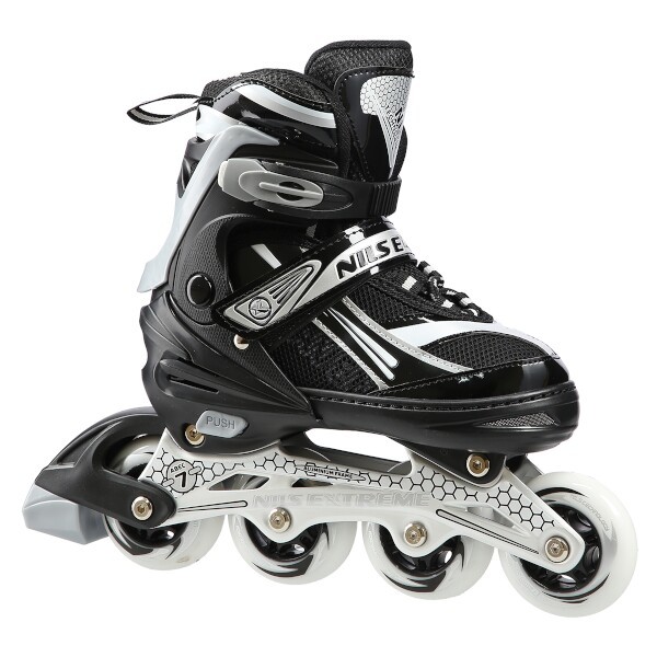 Kolečkové brusle NILS Extreme NA1123 jsou určeny k rekreační jízdě začínajících a středně pokročilých bruslařů. Lehká a odolná bota zajišťuje bezpečnost při jízdě. Systém ventilace a tvarovaná stélka boty přímo ovlivňují zvýšení uživatelského komfortu. Jedná se o model s nastavitelnou velikostí, kdy každá brusle má na výběr ze 4 rozměrů. Pomocí stisku tlačítka a posunutí špičky lze snadno a rychle nastavit velikost boty na noze uživatele. Kolečka s tvrdostí 82A jsou uložena v hliníkové liště, dobře přiléhají k podkladu a částečně pohlcují nervnosti. Model NA1123 je osazen ložisky ABEC 7, která se vyznačují precizním zpracováním a nízkým odporem, kdy jízda má dobrou setrvačnost a na bruslích tak lze urazit dlouhou vzdálenost bez vynaložení zbytečné síly. Zapínání brusle je řešeno klasickou trojkombinací - dvousekční přezka, řemínek se suchým zipem, šněrování. Pravá brusle je osazena brzdou.