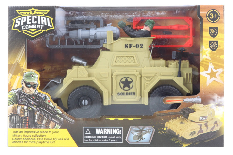 Vojenská sada obsahuje vojáka, obrněný jeep a další doplňky. Dělo na jeepu může střílet oranžové rakety. Rozměr balení cca 27,5 x 18 x 11,5 cm. Věk 3+ číst celé