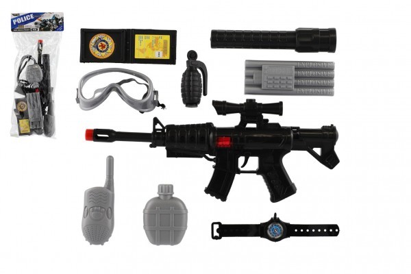 Každý z nás si nejednou hrál jako malý na policisty a zloděje. Reálně vypadající zbraň z plastu pro děti, samopal, se zajisté bude líbit všem klukům, kteří mají rádi zbraně. Policejní set, obsahuje samopal, granát, zaměřovač, hodinky a spoustu jiných potřebných doplňků. Rozměr samopalu: 38 cm Rozměr balení: 21 x 50 x 6 cm Vhodné pro děti od 3 let