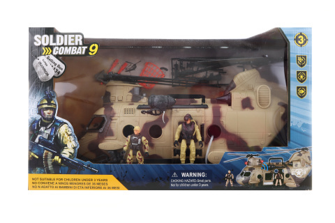 Vojenská sada s velkou helikoptérou. Materiál plast. Napájení na 2xAA baterie, které nejsou součástí balení. Po vložení baterií helikoptéra svítí a vydává zvuky. Baleno v krabici. Rozměry balení cca 55x32x20 cm. Věk 3+ číst celé