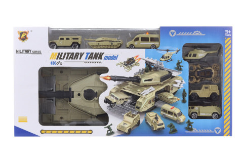 Vojenská sada velkého tanku s 6 autíčky a 1 helikoptérou. Materiál plast. Baleno v krabici. Rozměry balení cca 46x23,5x11 cm. Věk 3+