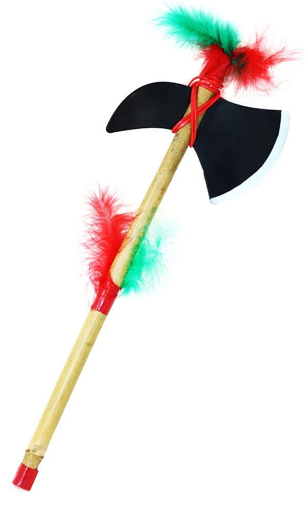 Indiánská karnevalová sekera o velikosti 38 cm. Sekera je vyrobena z PVC a gumy, také je zdobena barevným peřím. Perfektní ke kostýmu indiána! číst celé