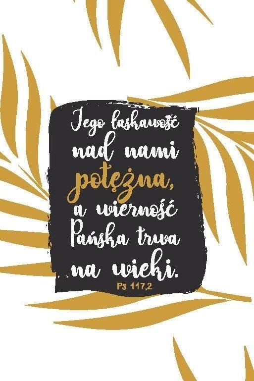 Kartka składana z kopertą.Kartka zawiera tekst:Jego łaskawość nad nami potężna, a wieczność Pańska trwa na wiekiKartka, w której możesz wpisać dowolny tekst życzeń na dowolną okazję.