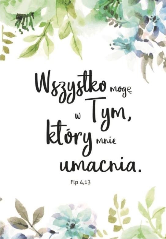Kartka składana z kopertą.Kartka zawiera tekst:Wszystko mogę w Tym, który mnie umacniaKartka, w której możesz wpisać dowolny tekst lub życzenia na dowolną okazję.
