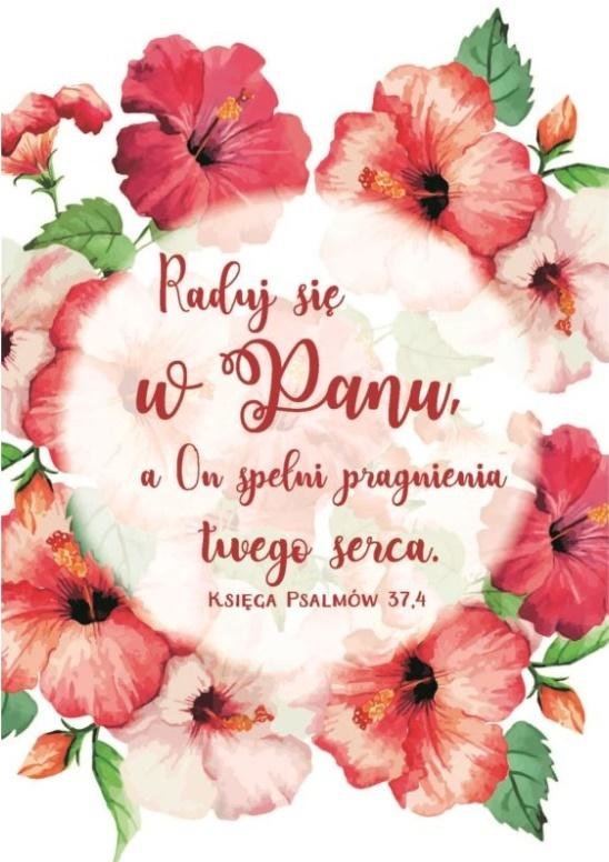 Kartka składana z kopertą.Kartka zawiera tekst:Raduj się w Panu, a On spełni pragnienia twego sercaKartka, w której możesz wpisać dowolny tekst lub życzenia na dowolną okazję.