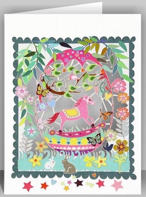 Karnet laserowo wycinany z kopertą. Z tyłu miejsce na życzenia. Wyprodukowany w Wielkiej Brytanii.
