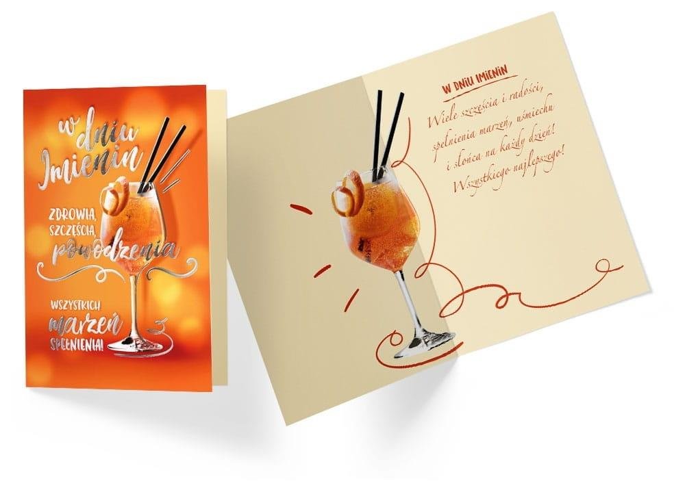 Kartka wielkości B6, zdobiona w zależności od wzoru metaliczną folią lub brokatem, kartka z tekstem w środku, kolorowa w środku i na zewnątrz.