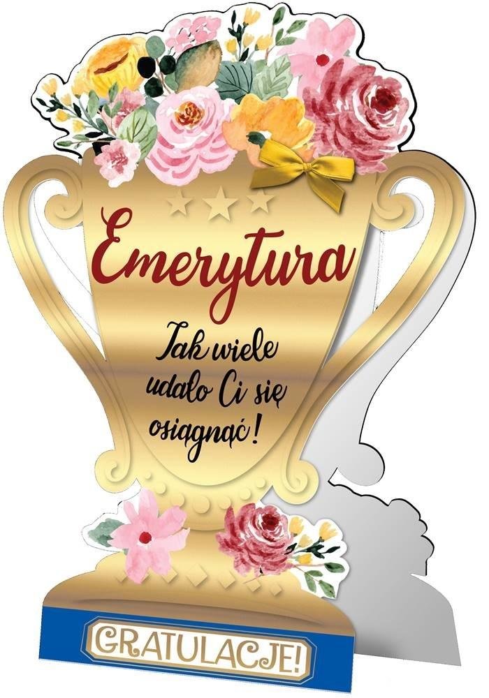 Kartki z serii Primus to więcej, niż się spodziewasz - to pamiątki godne zachowania na przyszłość i oglądania przy okazji wspominania wyjątkowych momentów w życiu. Każdy Primus to małe dzieło sztuki - bogato zdobione, smiałe i bezkompromisowo atrakcyjne. Emerytura to wyjątkowa okazja godna wyjątkowego prezentu, który zapadnie w pamięć - a taki właśnie jest ten karnet. Cechy szczególne: wielkość: niestandardowa, w kształcie pucharu, 25cmx 17,7cm,, karnet można postawić, zdobienia: dekoracje ze złotej foli holograficznej, koperta: dopasowana w komplecie, wnętrze kartki: życzenia w środku.