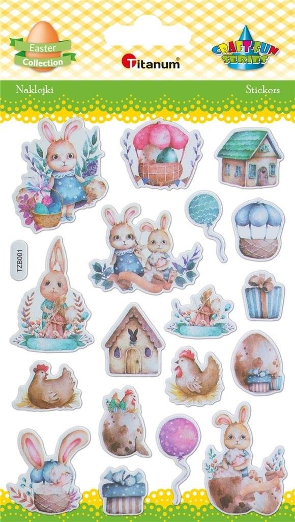 Naklejki wypukłe, wzory: zajączki, domki, koszyczki wielkanocne, kurki, balony akwarelowe. 18 sztuk.