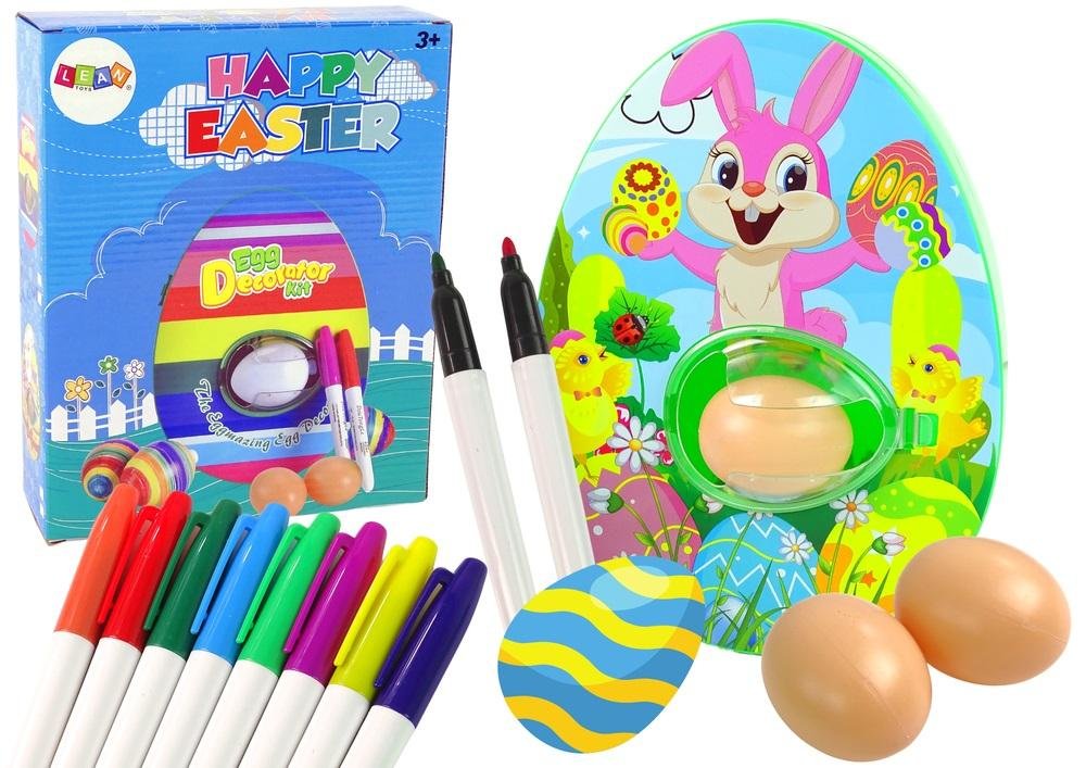 Wielkanocne Pisanki Jajka Do Malowania Przyrząd Dekorowanie Mały króliczek jako przyrząd do malowania jajek sprawi frajdę małym fanom Wielkanocy. Piękne ozdobione jajeczka wielkanocne będą idealną dekoracją na święta Wielkanocne, a w trakcie tworzenia piękny wzorów rozwinie w Twoim dziecku kreatywność i zmysł artystyczny. W zestawie znajdują się 3 sztuki jajeczek i zestaw 8 pisaków, czekają na stworzenie pięknych jajeczek. Przyrząd do malowania ma kształt jajka, z pięknymi naklejkami przypominającymi święta. Super zaletą i ułatwieniem jest malowanie wokół własnej osi, wystarczy przesunąć suwak po boku, a jajko będzie obracać się. Teraz możesz pomalować je z każdej strony. Stworzysz piękną ozdobę pokoju, która doda akcent świąteczny w Twoim domu. Jajka wykonane są z tworzywa sztucznego, bezpieczne i nietoksyczne, lekkie i mogą być używane przez długi czas. Elementy zestawu: - 8 pisaków - 3 jajka - przyrząd do malowania Wymiary: 24 cm x 18 cm x 10 cm Wymiary opakowania: 25 cm x 20 cm x 7 cm Zabawka odpowiednia dla dzieci powyżej 3 roku życia. Posiada certyfikat CE.