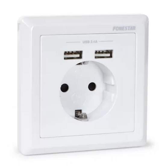 Instalační zásuvka 100-240V 16A s integrovanou 2x USB nabíječkou 5V 2,4A. je určena pro standardní povrchovou nebo zapuštěnou instalační krabici (krabice není v ceně).
