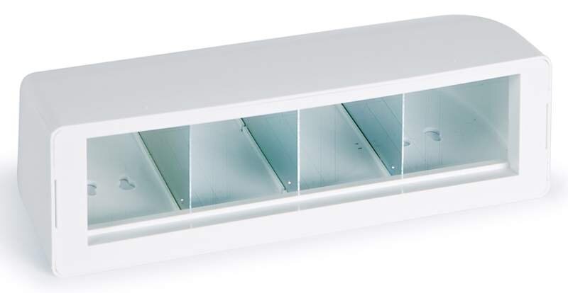 Instalační rám pro povrchovou montáž na 4 zásuvky. Je vhodný pro montáž na stůl, pod stůl nebo na stěnu. Kovová separace pro zajištění elektromagnetické izolace.