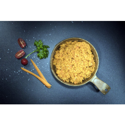 vepřové maso s rýží od tactical foodpack Myšlenka mrazu sušeného jídla pochází ze skutečných potřeb a požadavků speciálních sil na lehké a energetické potraviny a současně věnuje mimořádnou pozornost chuti produktů i jejich trvanlivost. Vše, co u Tactical Foodpack potřebujete, je trochu horké vody, trochu času a vychutnáte si skvělou chuť přímo z obalu. Výrobky byly vytvořeny a schváleny zvláštními silami různých zemí. Oproti na trhu dostupné lyofilizované stravě je velkou výhodou promyšlené balení, které nejen jde uzavřít, ale je možné ho ohřát na jakémkoliv dostupném zdroji tepla. Vydrží vařiče plynové, benzínové i lihové a svojí konstrukcí dokáže také dobře fungovat s vojenským rychloohřevem. Lyofilizované jídlo Tactical Foodpack je možno připravit za pomocí horké i studené vody. Dehydrované jídlo Tactical Foodpack je připravované bez umělých přísad a lyofilizované až jako finální proces. Produkty jsou vhodné i pro horolezce, turisty a samozřejmě pro vojáky.