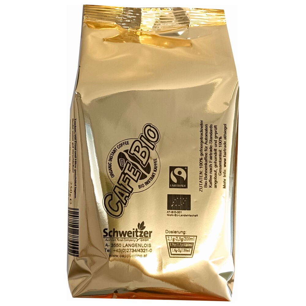 Velmi kvalitní bio instantní káva arabika z Bolívie, Mexika, Hondurasu a Peru ve větším balení v sáčku. Káva byla vypěstována dle pravidel ekologického zemědělství a obchodována v rámci certifikace spravedlivého obchodu Fairtrade International.