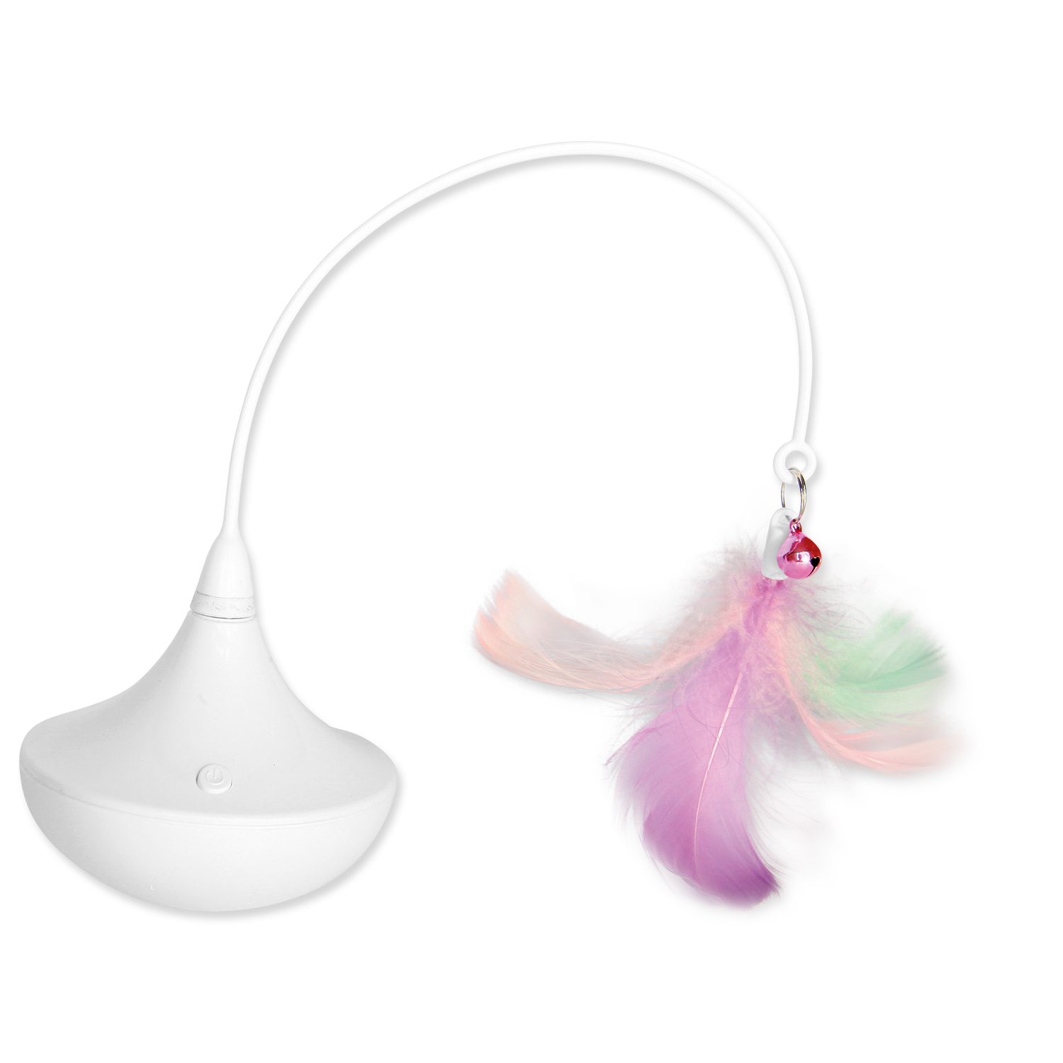 Otáčející se základna s pro kočky atraktivním třepetajícím se přívěskem z peří, který svým materiálem a pohybem v kočkách podporuje jejich přirozené lovecké instinkty.