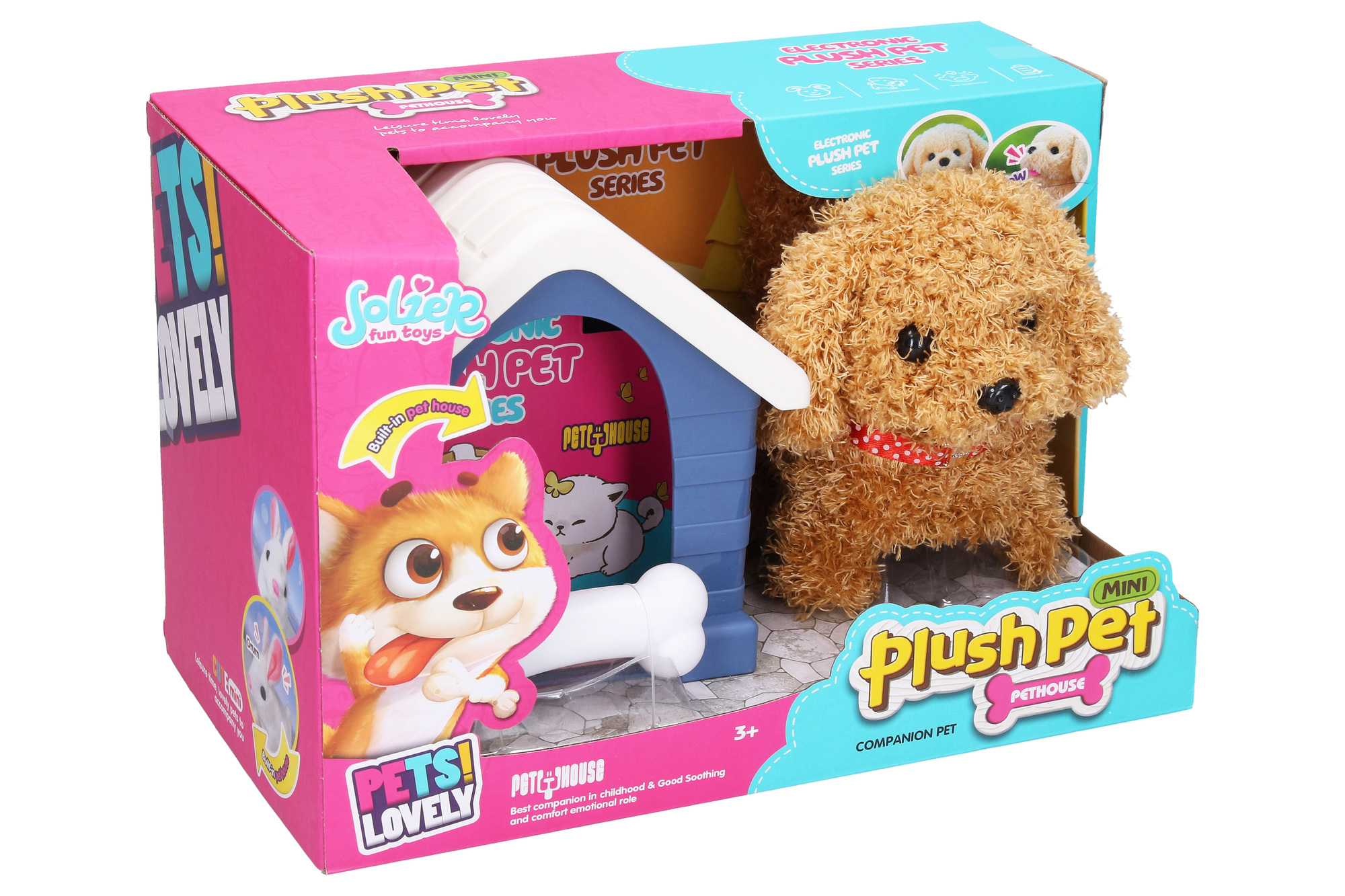 Pejsek s boudou. Velikost pejska 15cm. Velikost boudy 16cm. Obsahuje boudu, pejska, kost. 2xAA baterie nejsou součástí.