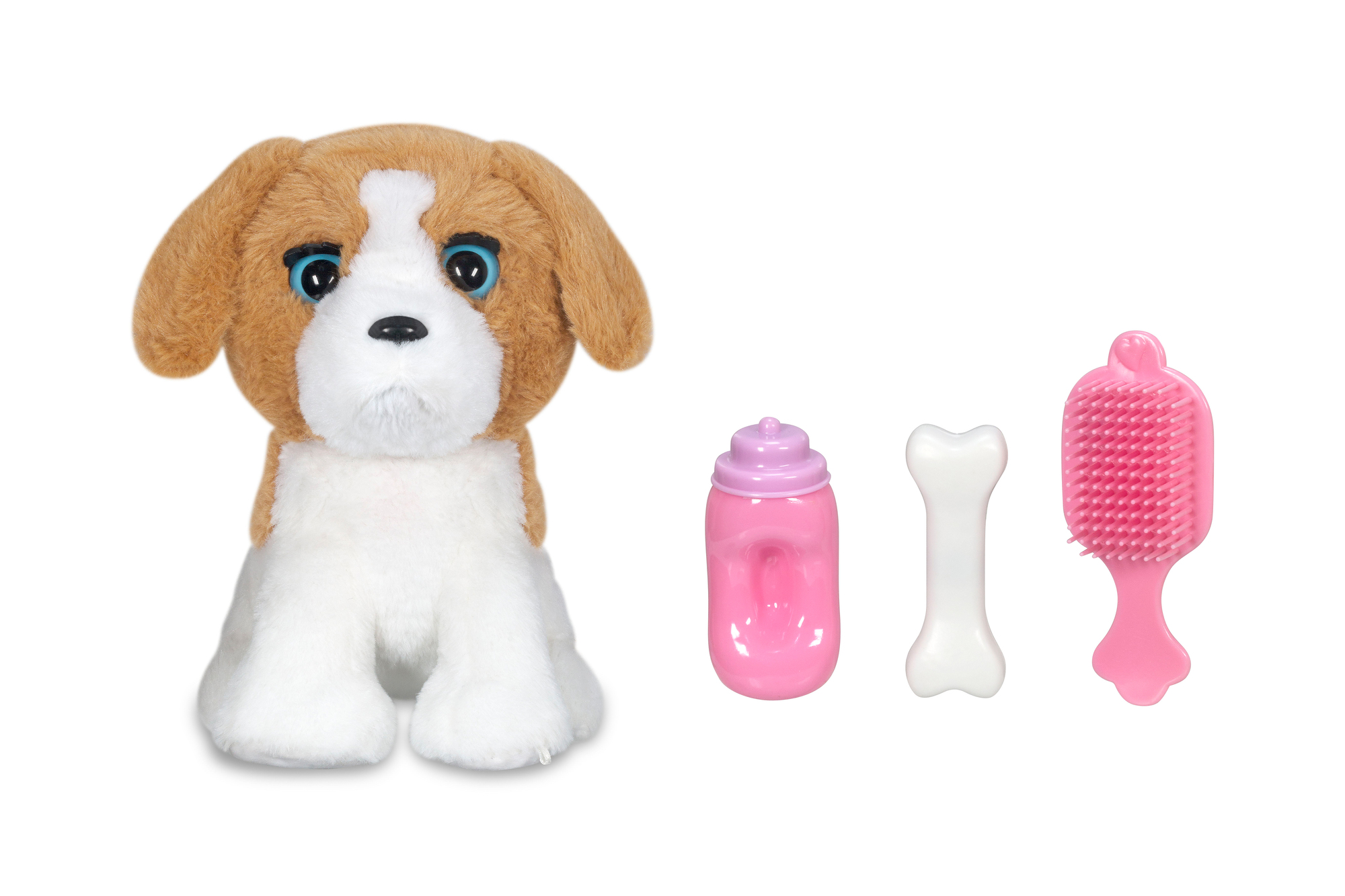 Stačí stisknout pravou packu nebo se dotknout dalších částí těla - hlavy, čumáku, hrudi či hřbetu - a pes začne štěkat, kýchat nebo vydávat další veselá zvuková upozornění. Třikrát poklepáním na hlavu pejsek zavře oči a usne, což dodává jeho chování na realističnosti. Navíc, pokud přiložíte láhev a kostičku k tlamičce, pejsek začne "papat" - to je zábava, která děti nadchne!