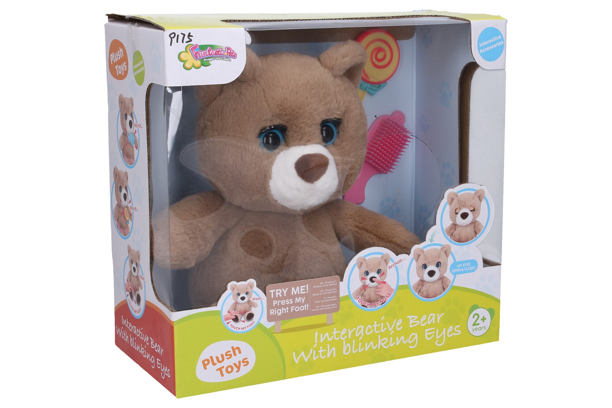 Medvěd interaktivní set. Velikost v sedu 27 cm. Zvukové efekty a mrkání stlačením levé ruky a přiložením předmětů nebo dotykem (stiskem) jiné části těla - hlavy, čumáku (kýchání), hrudi (smích). 3x rychlý dotek hlavy - zavře oči a spí. Přiložení lízátka a rybky k tlamičce - papání. 3xAA baterie součástí. Přepínač on/off/try me v zadní části hlavy. Součástí hřeben na česání.