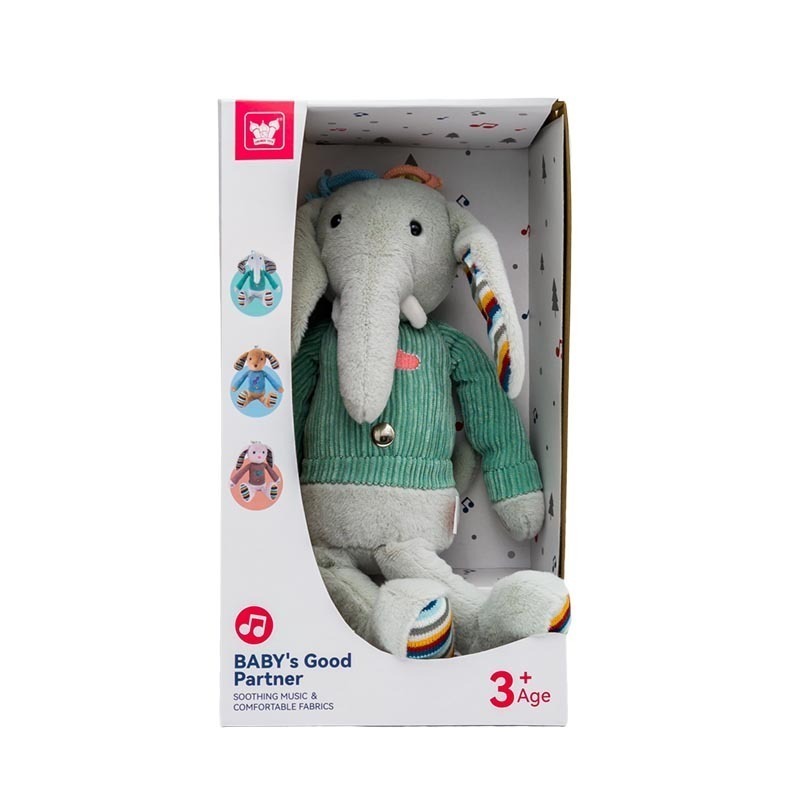 Cechy produktu: - uroczy i funkcjonalny pluszowy przyjaciel w formie słonika z wesołymi efektami dźwiękowymi, - został wykonany z przyjemnych w dotyku materiałów z miękkim wypełnieniem, co sprawia, że jest idealny do przytulania, - ubrany jest w śliczny sweterek w kolorze zielonym z dekoracyjną naszywką w kształcie różowej nutki, - radosne piosenki aktywują się po naciśnięciu specjalnego guziczka umieszczonego na brzuszku oraz obu łapkach słonika, - pluszowy słonik zapewni Twojemu dziecku wspaniałą zabawę w ciągu dnia, jak i poczucie bezpieczeństwa w nocy, - zabawka została umieszczona w opakowaniu z okienkiem. Baterie: 3xAAA 1,5V (brak w zestawie) Wymiary opakowania: 19,5x34,5x17cm Wiek: 3+