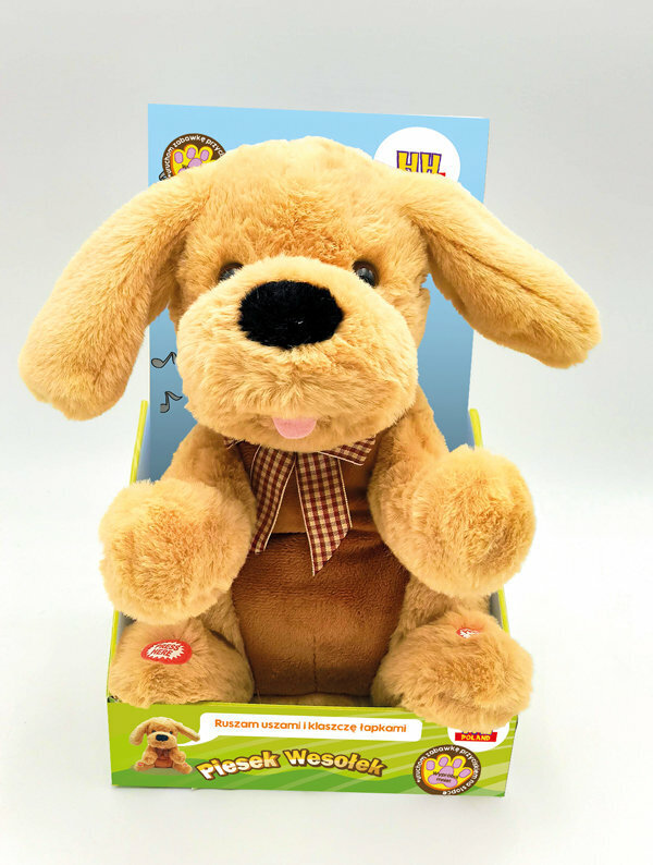 Wesołek to interaktywny, pluszowy piesek, który idealnie sprawdzi się jako przyjacielski towarzysz dla każdego dziecka. Piesek pokryty jest przyjemnym w dotyku futerkiem z miękkim wypełnieniem. Na jego szyi umieszczono ozdobną kokardkę w kratę. Piesek potrafi opowiedzieć trzy różne bajki i zaśpiewać dwie piosenki, machając przy tym wesoło uszami i klaszcząc łapkami. Są to bajki, takie jak: Brzydkie kaczątko, Kot w butach i Księżniczka na ziarnku grochu oraz piosenki, takie jak: Karuzela czeka i Pieski małe dwa. Efekty dźwiękowe aktywują się po naciśnięciu łapek. Pluszak doskonale sprawdzi się jako prezent, który zapewni mnóstwo radości i przyniesie uśmiech na twarzy dziecka, stając się nieodłącznym towarzyszem na wiele lat.Baterie: 3xAA 1,5V (dołączono)Wymiary opakowania: 19x16x31cmWiek: 18m+
