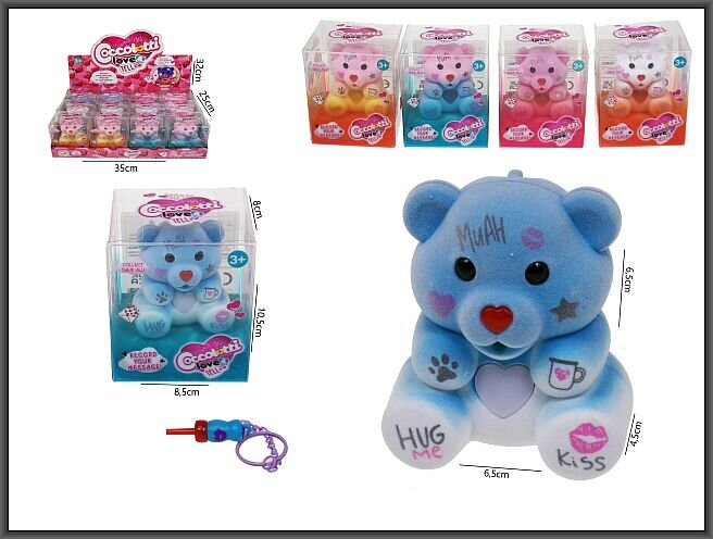 Miś flokowany nagrywający .Po naciśnięciu na serduszko znajdujące się na brzuszku misia zaświeci się serduszka znajdujące się na nosku misia i wtedy można nagrać wiadomość . Po ponownym krótkim naciśnięciu serduszku na brzuszku , serduszko na brzuszku zaświeci się zmieniają się kolory oraz serduszko na nosku też się zaświeci i wtedy odtworzy się nagranie .W zestawie butelka ze smoczkiem , po włożeniu go do buzi misia słychać odgłosy ssania . Jest również łańcuszek na którym można zawiesić misia jak breloczek .pakowanie 12/96