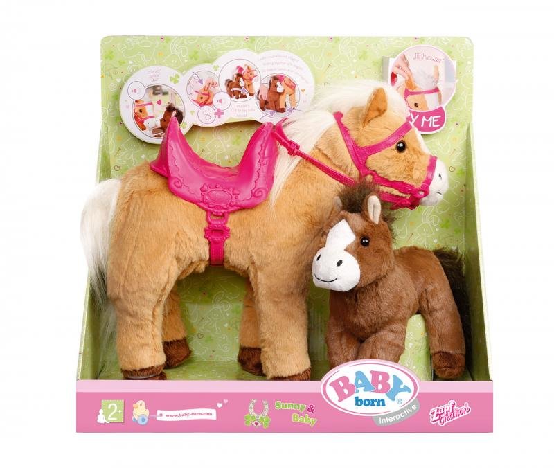 Hopsa hejsa po pokojíčku, polích a loukách. Když stiskneš levé ucho krásné koňské maminky Sunny s bílou hřívou, rozejde se kupředu. Když jí stiskneš pravé ucho, uslyšíš, jak zaržá a jak zavolá na své tmavě hnědé hříbátko.Malé hříbátko se hezky drží u své maminky. Klisna Sunny a její hříbátko se totiž rádi mazlí. Když se dotknou čumáčky, uslyšíš, jak si dají pusinku. Aby BABY born mohla se Sunny jezdit na vyjížďky, je pro ni v balení připraveno růžové sedlo. Funguje na baterie, které jsou součástí balení.