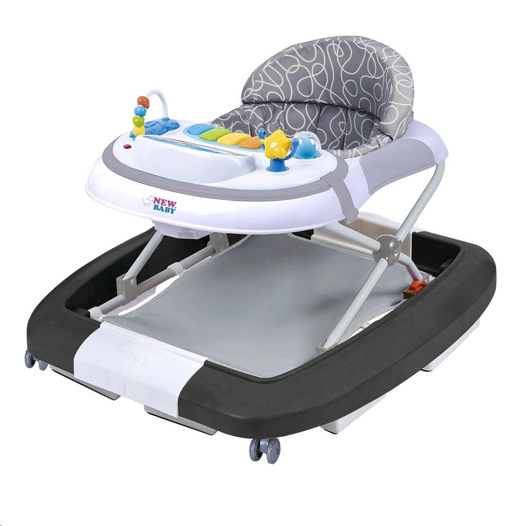 Dětské chodítko s houpačkou NEW BABY v moderním designu se čtyřmi kolečky a šesti bezpečnostními podložkami pomáhá dítěti se stabilitou při chůzi a zároveň přináší svět zábavy díky hracímu pultíku a možnosti jednoduché přestavby na houpačku. Interaktivní hrací pultík obsahuje různé hračky, piánko a 3D barevný obrázek mořského světa, vydává zvuky, svítí a lze jej vyjmout pro přístup k jídelnímu pultu. Chodítko je nastavitelné do několika poloh a má velice pohodlný potah, který lze vyprat a je v zadní části vyztužený. Vyrobeno z kvalitního plastového materiálu.