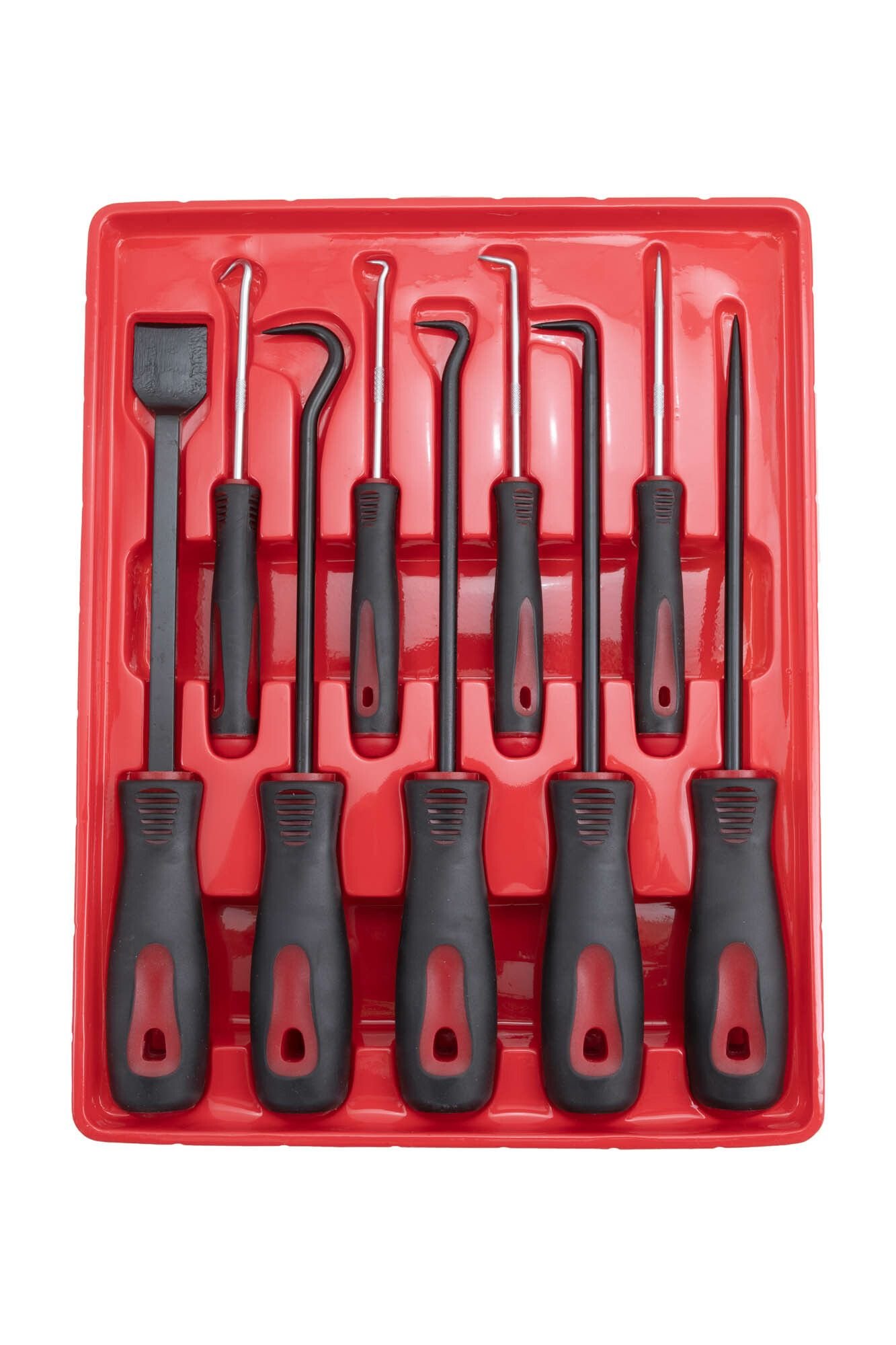 Praktická sada devíti univerzálních ocelových hrotů, špic a škrabky k odstraňování gufer, těsnění, O-kroužků, návleků, seškrabávání ztuhlých nečistot, propichování nádob aj. Háčky a špičky jsou různě velké a zahnuté, díky čemuž bude přístí výměna těsnění hračkou. Nářadí má pohodlný pevný plastový úchop s měkkým pogumováním, a v rukojeti má otvor pro zavěšení na stěnu. Dodáváno v plastovém výlisku, který lze použít jako organizér v šuplíku dílenského vozíku. Vyrobeno z kvalitní chrom-vanadové oceli (Cr-V). Obsah balení: