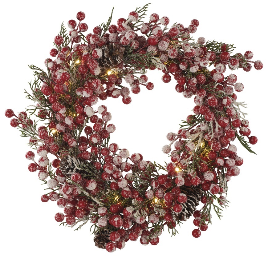 Věnec z umělými bobulkami se zamrzlým efektem s jemným LED podsvícením se hodí téměř do každého interiéru.