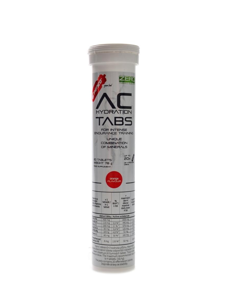 Při tréninku trvajícím déle než hodinu nebo sportovní činnosti vyšší intenzity se potem ztrácí nejen voda, ale i minerály. Podle dostupných údajů největší ztráty elektrolytů představují sodík, draslík a chloridy. V 1 litru potu se průměrně vyloučí kolem 1 g sodíku. Ztráty vápníku a hořčíku jsou výrazně nižší. Rovnováha elektrolytů má vliv nejen na zdraví, ale i na výkonnost. Denní dávka Penco® AC Hydration Tabs 4 tbl = 2 litry nápoje obsahuje 1,6 g sodíku, 0,4 g draslíku a je zdrojem, vápníku a hořčíku, které přispívají k normální činnosti svalů. Draslík je důležitý pro normální činnost nervové soustavy, podporuje činnost svalů a přispívá k udržení normálního krevního tlaku. Je obohacen vitamínem C a kyselinou pantothenovou pro snížení míry únavy a vyčerpání. Podle délky a intenzity sportovní činnosti je vhodné používat Penco® AC Hydration Tabs během výkonu v menších dávkách v intervalech 10-15 min.. Lze také kombinovat s iontovými nápoji Penco® Mineral Drink nebo Penco® Energy Drink, které navíc dodají energii.