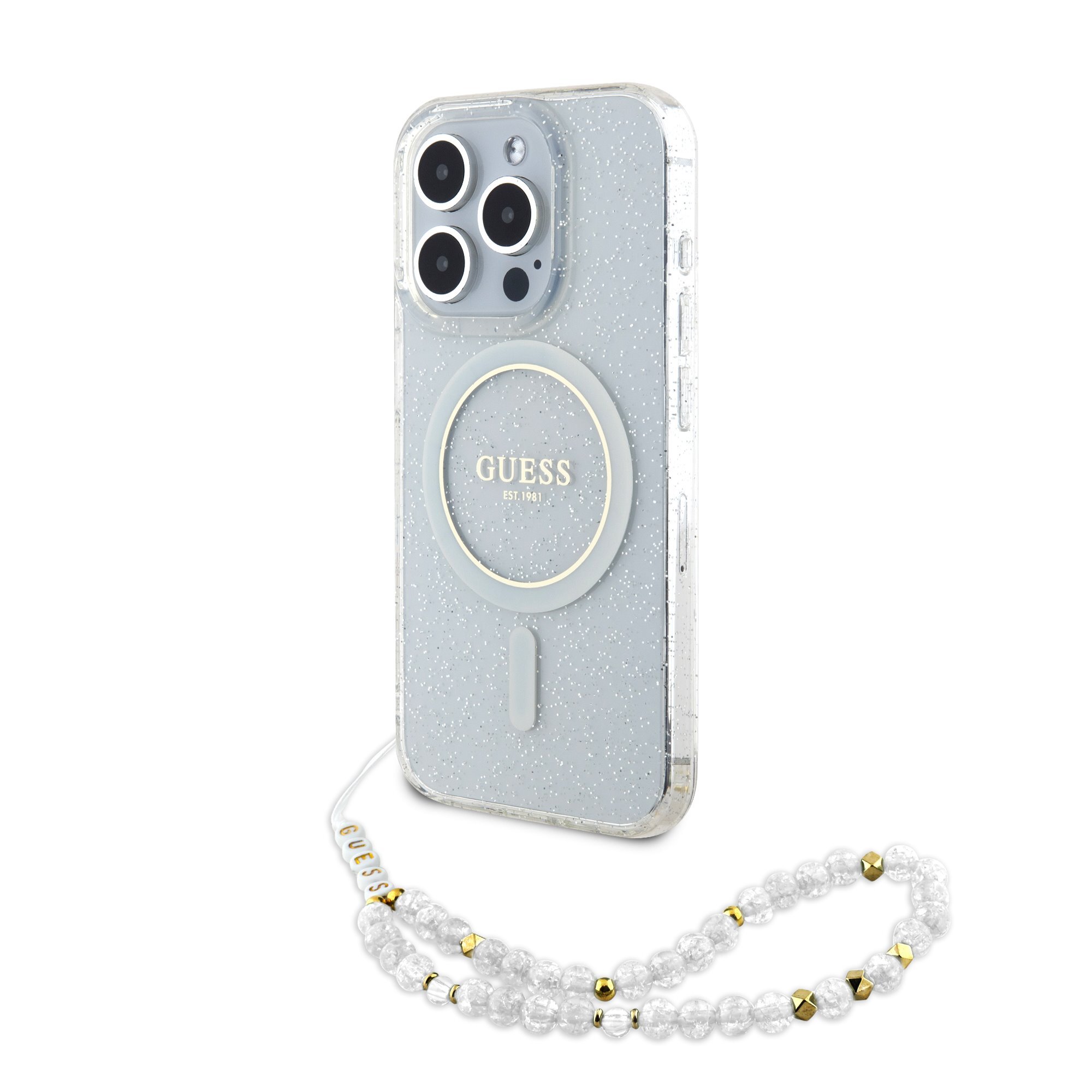 Guess IML Glitter Pearl Strap MagSafe Zadní Kryt pro iPhone 15 Pro Max Transparent