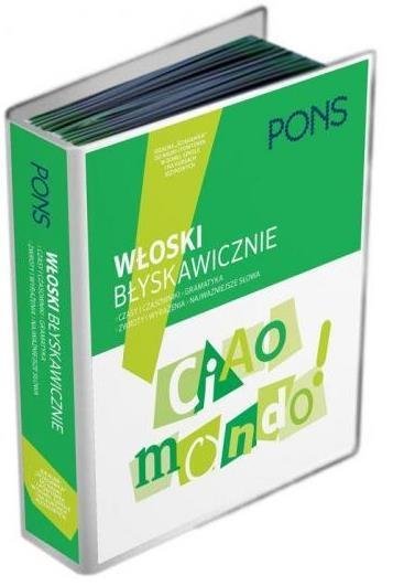 Błyskawicznie włoski - segregator językowy Pakiet językowy PONS to zbiór czterech tablic językowych do nauki włoskiego ,wpiętych w jeden praktyczny segregator, pozwalający na ułożenie treści zgodnie z potrzebami uczących się. Segregator zapewnia szybki dostęp do czterech, najczęściej stosowanych obszarów językowych: (1) objaśnień gramatycznych, wraz z przykładami ich użycia, (2) czasów i czasowników, pozwalających na zrozumienie ich tworzenia oraz listami różnych form czasownikowych, także (3) najpopularniejszych zwrotów językowych oraz (4) ułożonego tematycznie słownictwa z danego języka. Każda tablica ma formę wpinanej harmonijki, tworząca aż 12 stron formatu A5, co pozwala na zawarcie w niej odpowiedniej ilości informacji językowych dla osób uczących się włoskiego.