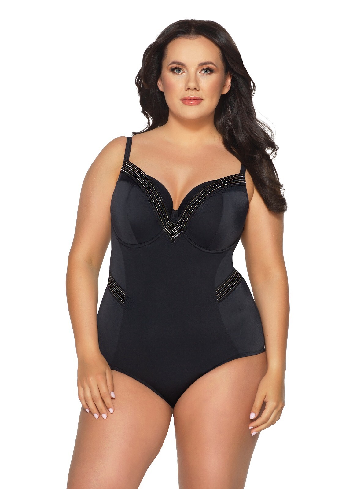 Jednoczęściowy kostium kąpielowy- klasyczny krój- miseczki full cup, z fiszbinami, stabilnie podtrzymują biust- ramiączka nieodpinane- na biuście i powyżej linii bioder połyskujące taśmy- na plecach metalowe zapięcie- przód podszyty stabilną dzianiną