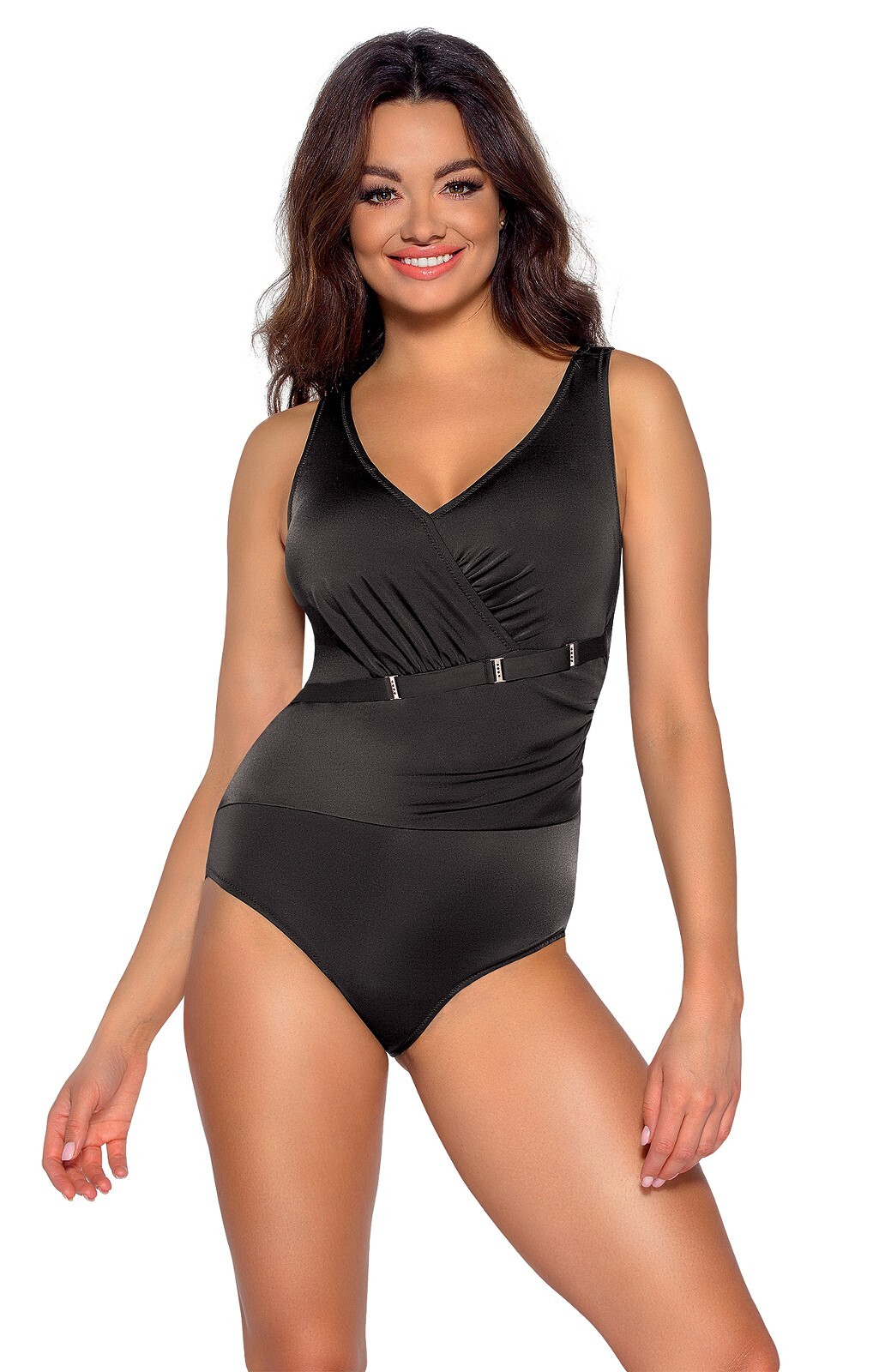 Jednoczęściowy kostium kąpielowy- jednolita mikrofibra- miseczki delikatnie usztywnione- efektowne marszczenie na biuście- w talii pasek z biżuteryjnymi sprzączkami, z regulacją- głęboko wycięte plecy
