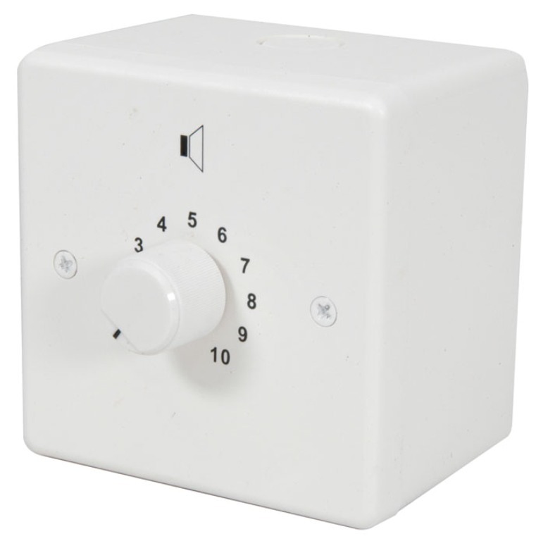 Montážní PA ovladač hlasitosti s 24V nouzovým prioritním relé, transformátor pro 100V linkovou techniku, útlum v 10 krocích (8 x 3dB a 2 x 6dB), bílý plastový přední panel a knoflík, povrchová montáž, montážní hloubka 47 mm, připojení šroubem.