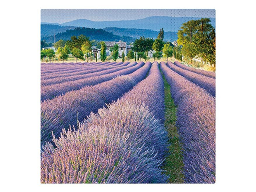Třívrstvý papírový ubrousek. Krásné kvalitní ubrousky s motivem lánů levandule vykouzlí příjemnou atmosféru. Ideální na zahradní prostírání, oslavy nebo na zkrášlení interiéru.