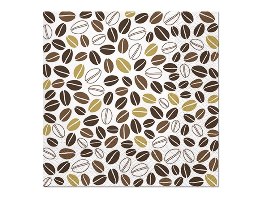 Třívrstvý papírový ubrousek. Krásné kvalitní ubrousky s motivem kávových zrn dodají prostřenému stolu nádech. Ideální do restaurace, na zahradní stolování nebo do kaváren. Zkrášlíte tak každé prostírání.