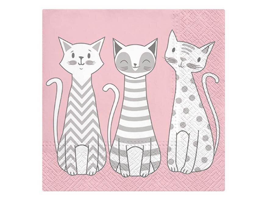 Třívrstvý papírový ubrousek. Krásné kvalitní ubrousky s motivem koček na růžovém podkladu vykouzlí příjemnou atmosféru. Ideální na zahradní prostírání, oslavy nebo na zkrášlení interiéru.