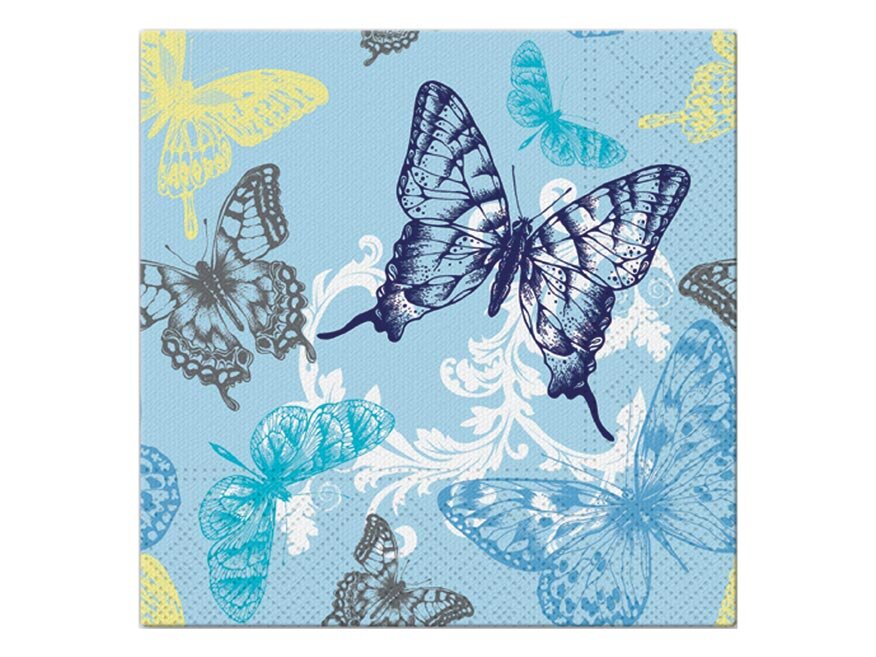 Papírový velikonoční ubrousek. Ubrousky s barevnými motýly vnesou pocit lehkosti do vašich jarních domovů. Ubrousek je kvalitní z třívrstvého papíru. Vhodný i na ubrouskovou techniku.