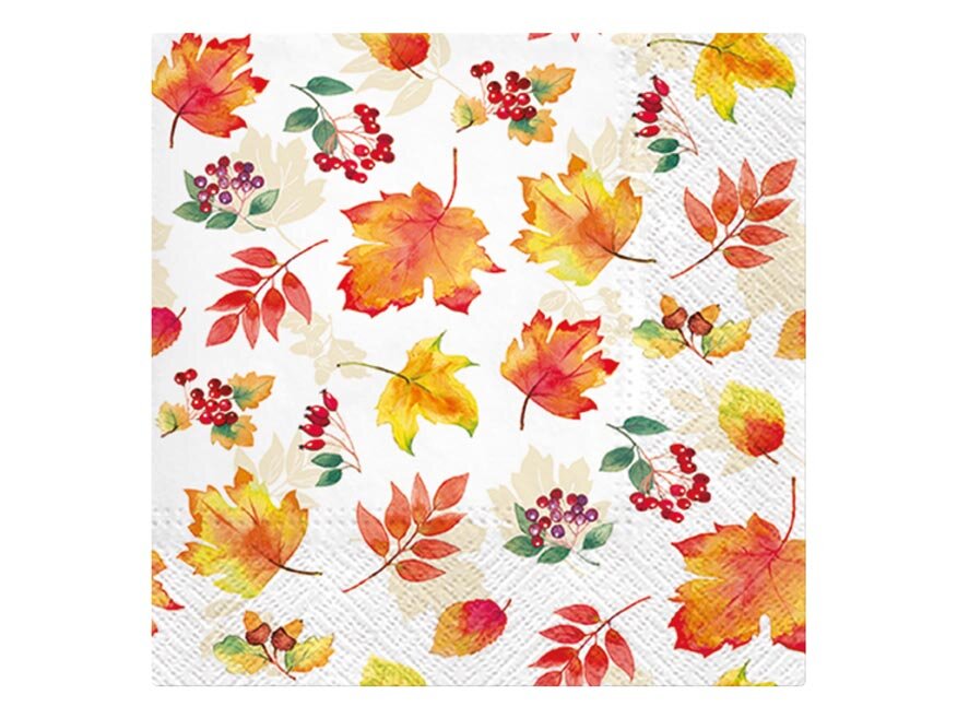 Třívrstvý papírový ubrousek. Krásné kvalitní ubrousky s motivem podzimního listí a plodů na bílém podkladu vykouzlí příjemnou atmosféru. Ideální na zahradní prostírání, oslavy nebo na zkrášlení interiéru.