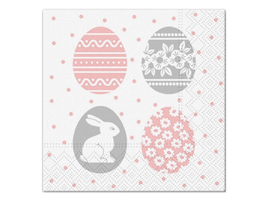 Papírový velikonoční ubrousek. Ubrousky s velikonočním motivem v decentních barvách s barevnými puntíky hravě zapadnou do vašeho interiéru. Ubrousek je kvalitní z třívrstvého papíru. Vhodný i na ubrouskovou techniku.