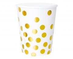 Papierowe kubeczki w kolorze białym ze złotymi groszkami.