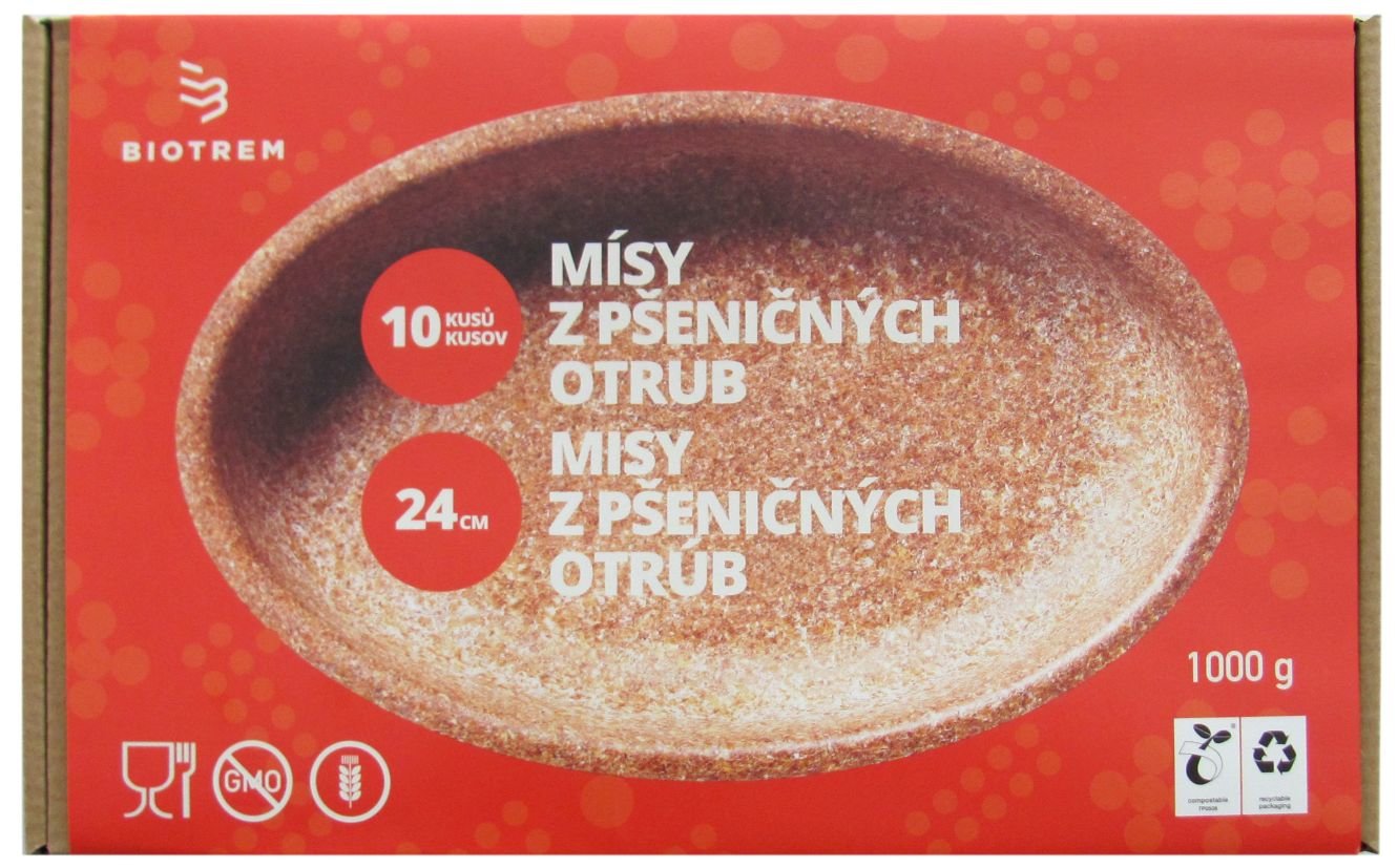 100% přírodní oválná miska o rozměru 24 cm, vyrobená z pšeničných otrub - balení 10 ks. Misky jsou pevné a odolné proti mastnotě, jsou vhodné pro teplé i studené, stálé či tekuté pokrmy. Lze použít v horkovzdušné (max. teplota 180°C) i v mikrovlnné troubě. Po použití mají schopnost rozkladu do 30 dní. Nádobí je šetrné k životnímu prostředí, lehce rozložitelné a dá se i sníst :). Skvělá náhrada za jednorázové plastové nádobí.